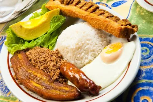 Plato tradicional colombiano con arroz, frijoles, carne molida, chicharrón, huevo frito, plátano maduro, arepa, aguacate y morcilla. ¡Sabor auténtico y abundante!