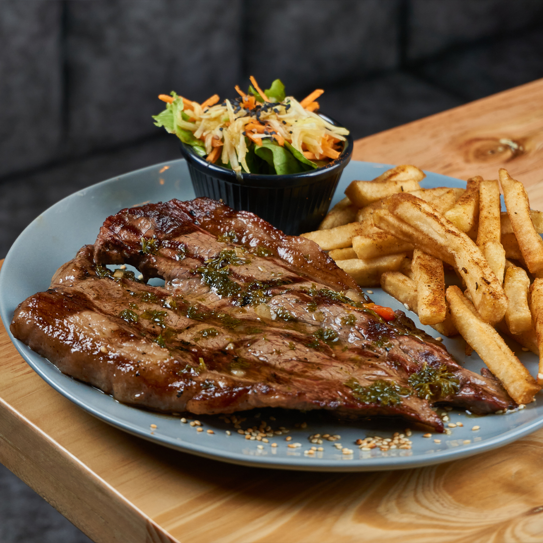 Corte tierno y jugoso de carne de res, asado a la perfección y sazonado al estilo colombiano. Se sirve con papas criollas, yuca, ensalada fresca y ají, ideal para los amantes de la buena carne.